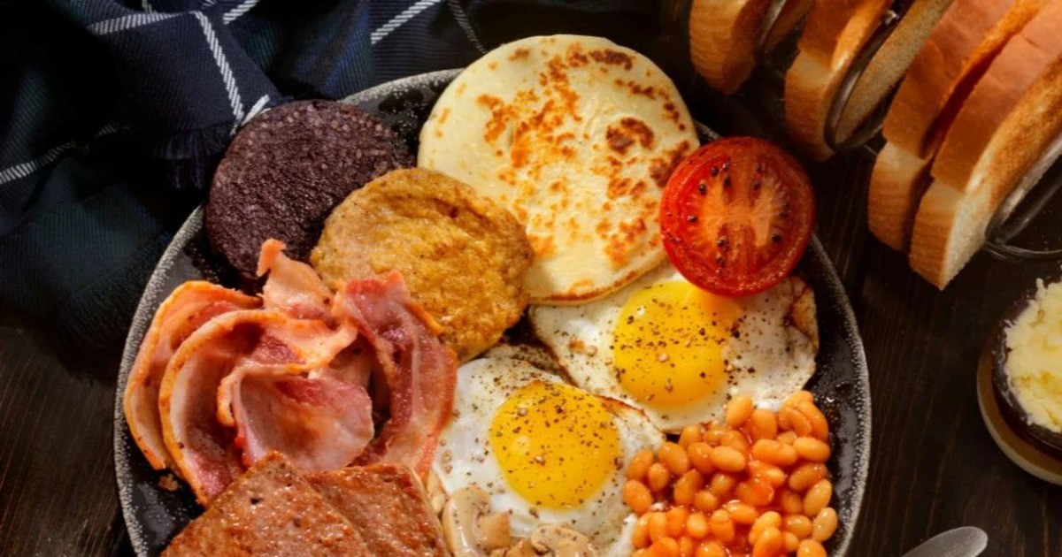 A traditional Scottish breakfast includes items such as bacon, sausage, black pudding, tattie scones (potato scones), fried tomatoes, mushrooms, and sometimes haggis. It's a hearty meal designed to provide energy for the day ahead.
