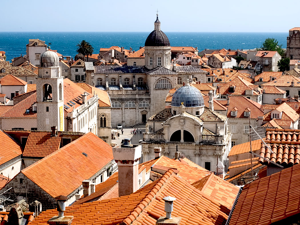 Dubrovnik Old Town with terracotta rooftops, domed churches, and the Adriatic Sea in the background Crowd level: High, particularly in summer
