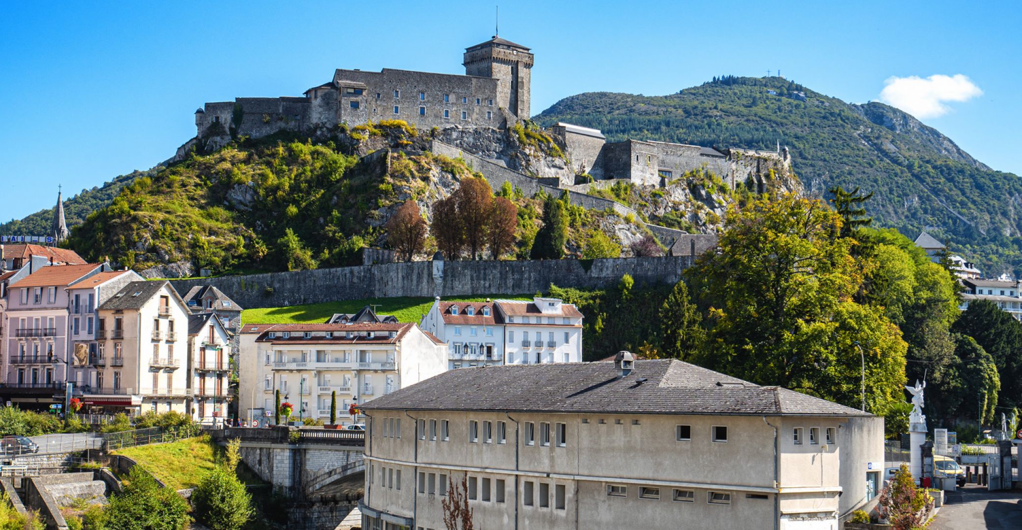 Stone fortress and hillside town nestled in the Pyrenees mountains under a bright blue sky Crowd level: Low