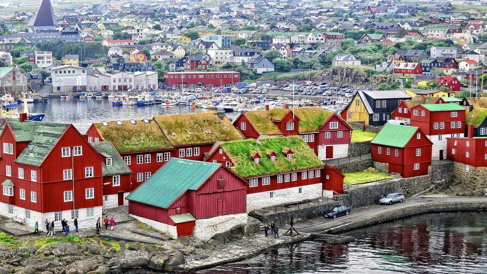 Colorful red houses with grass roofs in a harbor village in the Faroe Islands Crowd level: Low