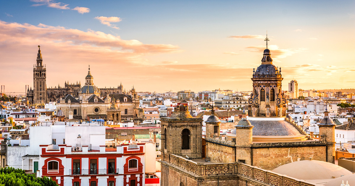 Skyline of Seville with cathedral domes and the Giralda tower rising above historic buildings at sunset Crowd level: Low to Medium outside summer