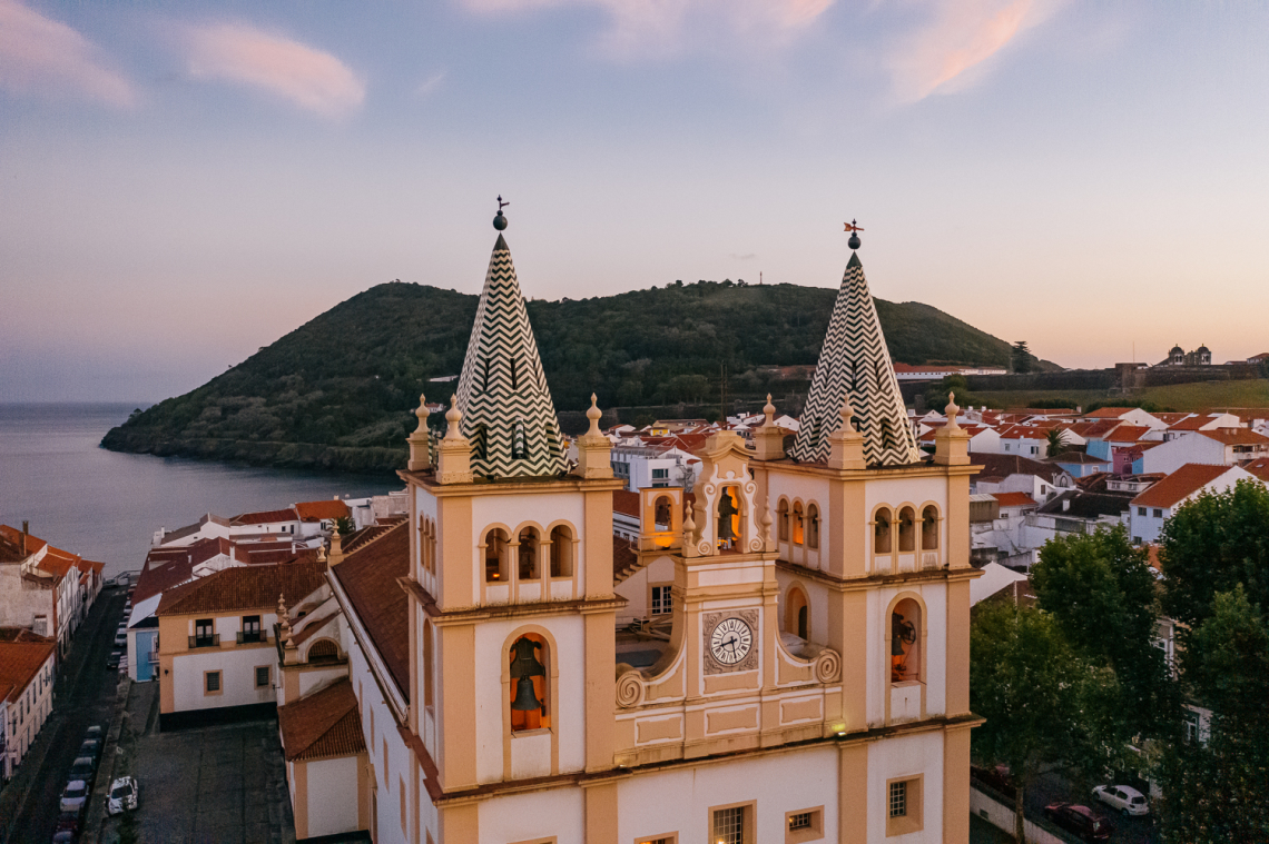 Historic church with twin patterned towers overlooking a coastal town in the Azores at sunset Crowd level: Low to Medium