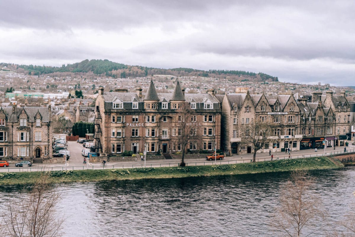 Historic buildings and hotels along a river in a Scottish Highlands town under cloudy skies Crowd level: Low to Medium (Isle of Skye can be High in summer)