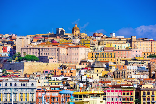 Colorful historic buildings along the waterfront in Cagliari, Sardinia, under a bright blue sky Crowd level: Low to Medium
