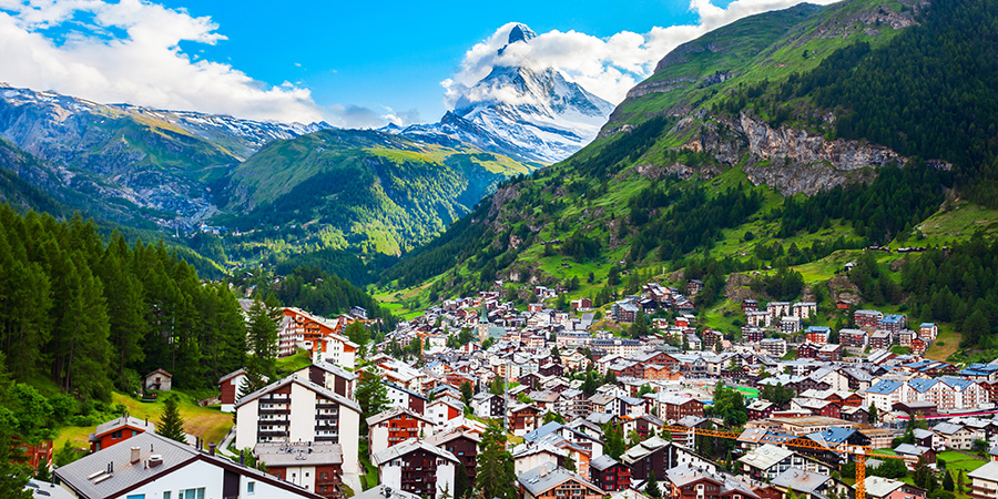 Alpine village surrounded by green valleys and snowy peaks with the Matterhorn rising in the background Crowd level: Medium