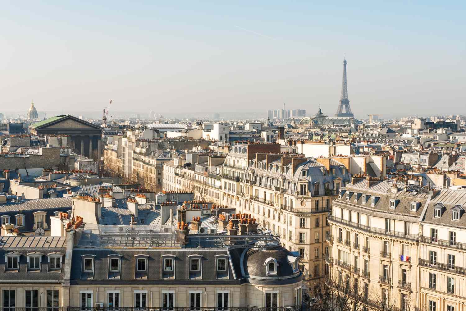 Paris rooftops with classic Haussmann buildings and the Eiffel Tower rising in the distance Crowd level: High at iconic spots, Low in hidden locations