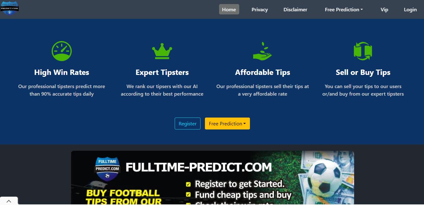 The homepage of the Fulltime-Predict website This website offers football game predictions without any charges. Users can select from a range of predictions spanning leagues across the world. Fulltime-Predict presents three distinct types of football predictions on its platform: