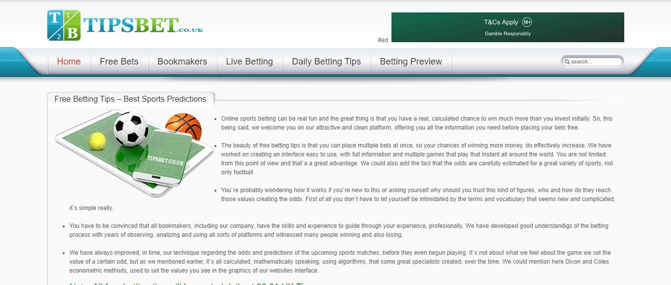 The homepage of the Tipsbet.co.uk website Regarded as one of the foremost football platforms, this website boasts a widespread recognition for its reliability and profitability. It stands as a hub for intelligently crafted content, known for its insightful value. Within this digital realm, users are privileged to access complimentary betting recommendations that undoubtedly enhance their betting choices.