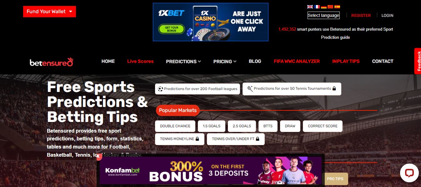 The homepage of the Betensured website Operating on a global scale, Betensured emerges as a premier betting prediction service, particularly celebrated within Nigeria's betting landscape. Distinguished by its comprehensive approach, the platform spans football events across a multitude of leagues, with each league receiving its dedicated analysis. Moreover, Betensured offers valuable insights into forthcoming football matches, enabling users to strategize effectively.