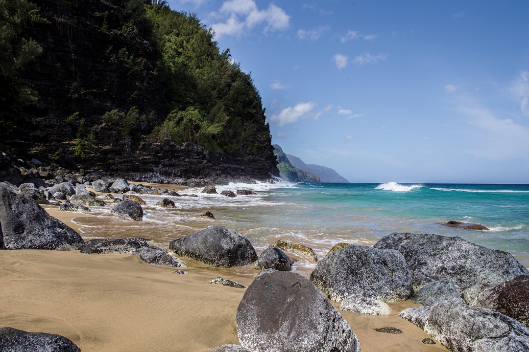 Hideaways Beach (Pali Ke Kua Beach):For those seeking a quieter, tucked-away spot, Hideaways Beach near Princeville offers white sand and turquoise water, though access is via a steep, sometimes muddy trail with ropes.
