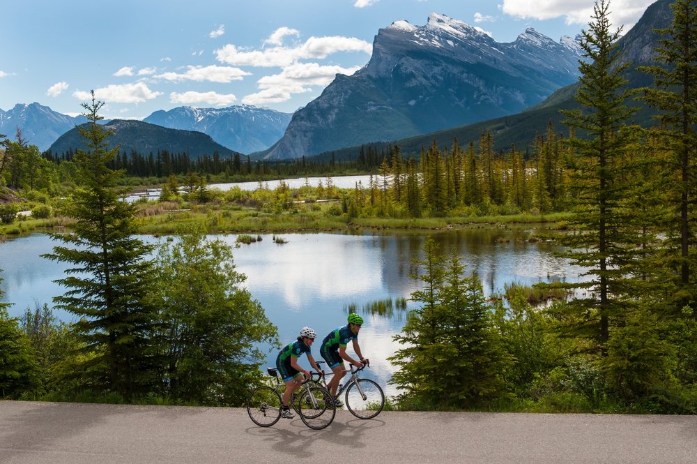Some cyclists biking on Vermilion Lakes Drive Lake Minnewanka Loop is an excellent destination. Take a journey on the Lake Minnewanka bus during the summer months to see some of the area's most beautiful lakes, such as Johnson Lake and Two Jack Lake.