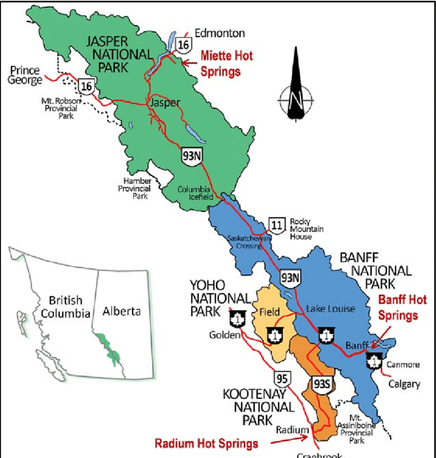 The Trans-Canada Highway travels through Banff National Park from near Canmore to Yoho National Park in British Columbia.