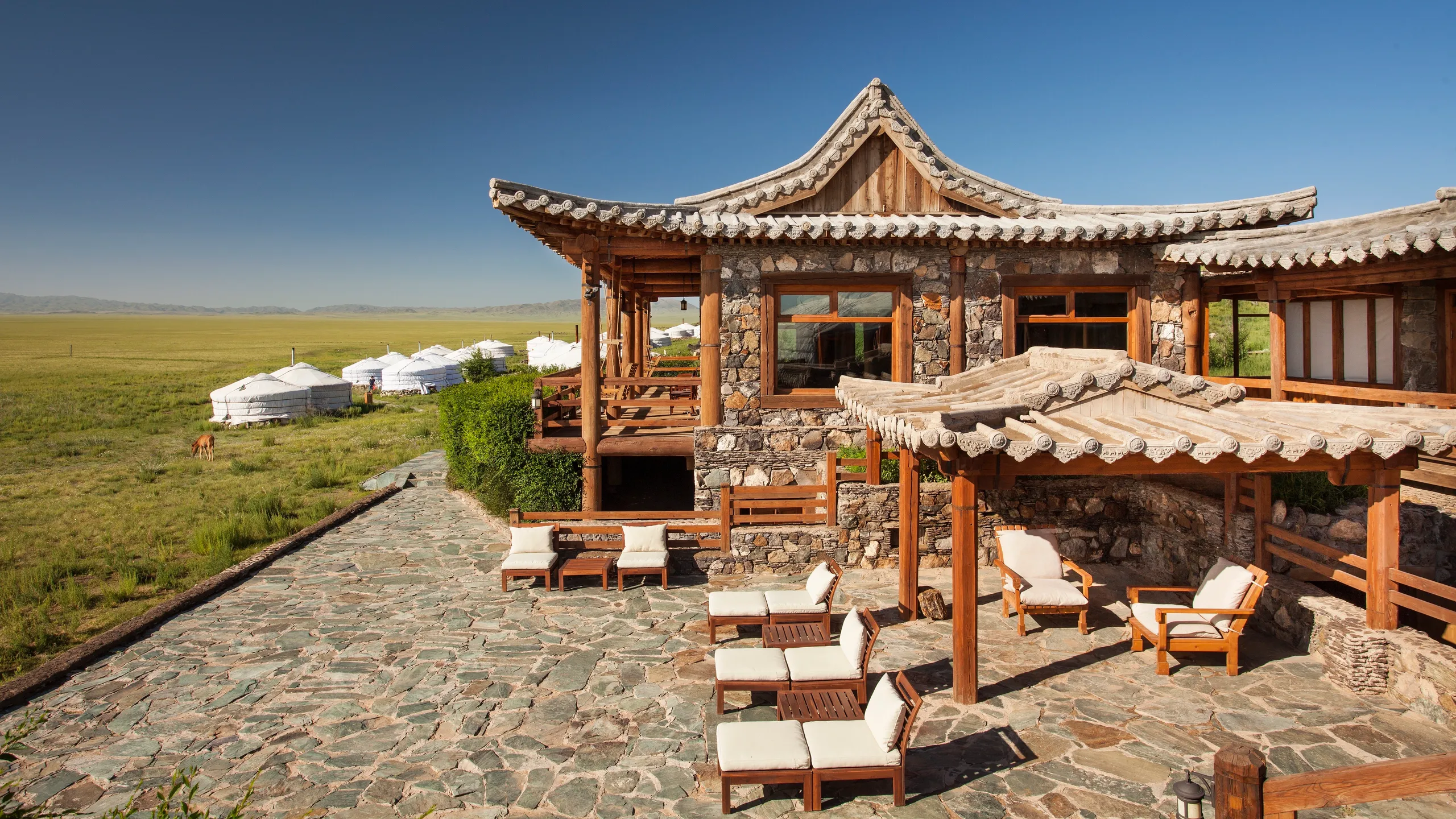 Three Camel Lodge (Mongolia) Three Camel Lodge is in Mongolia’s Gobi Desert. It runs on solar and wind power, uses eco toilets, and supports local culture and wildlife protection.
