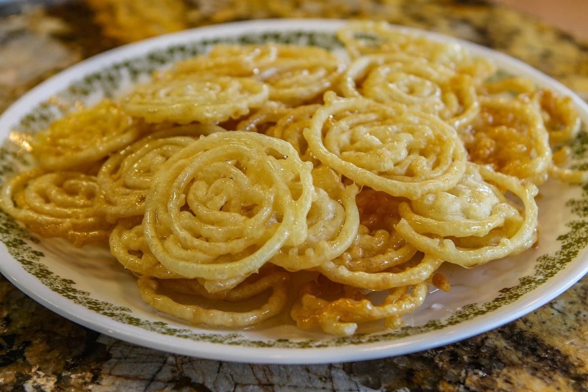 A deep-fried sweet coil soaked in syrup, enjoyed across the Middle East. Its golden color and delicate crispness make it a favorite accompaniment to tea.