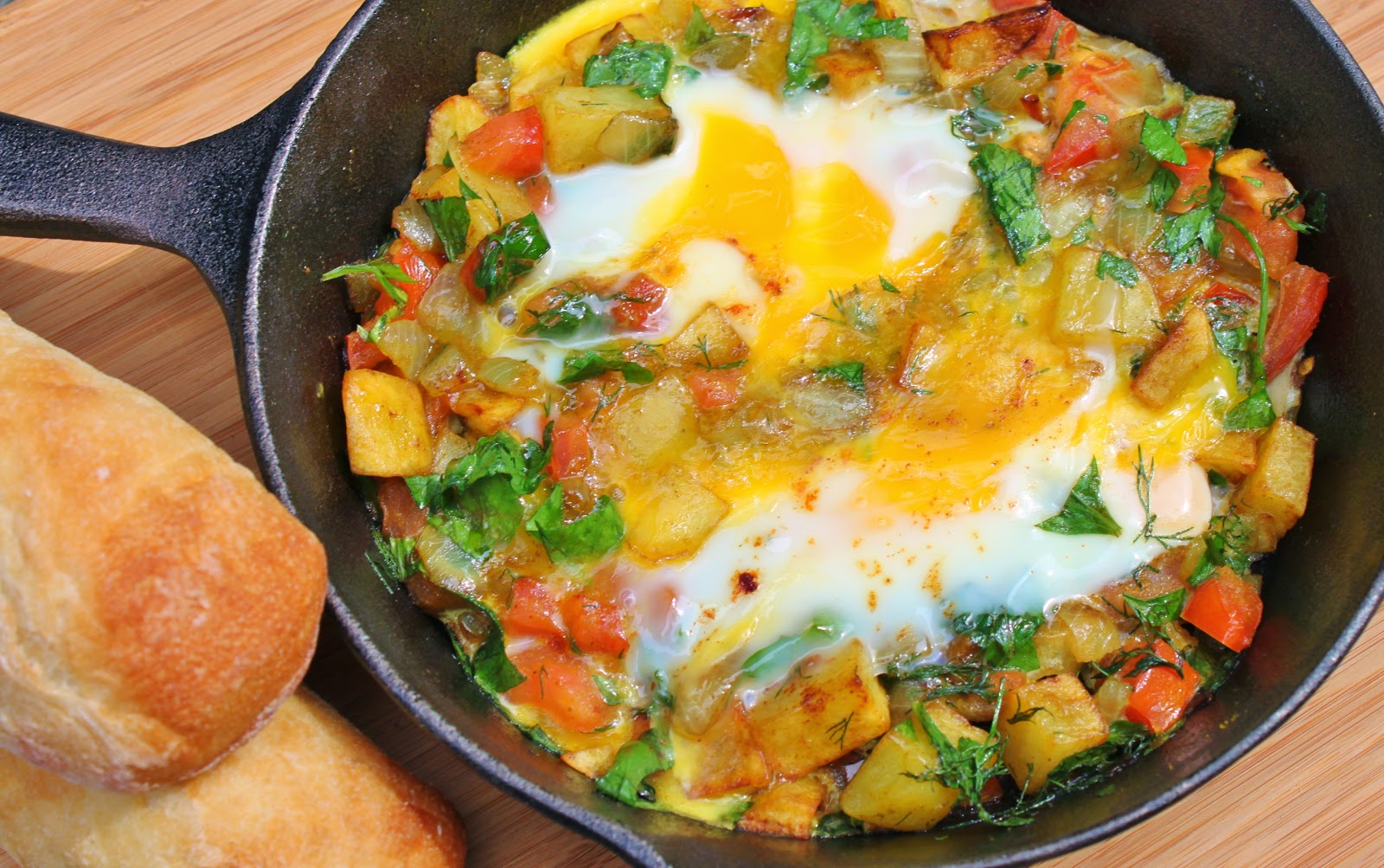 - Once the lamb mixture is cooked, crack eggsover the top and cook until set.