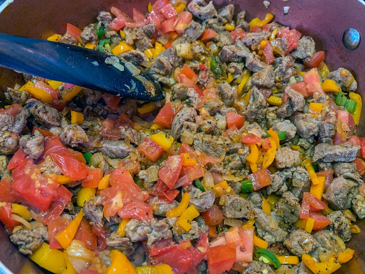 - Sauté minced lambwith onions, bell peppers, and tomatoes.