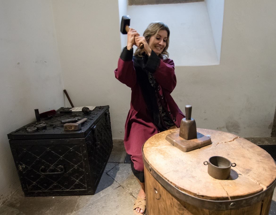 A woman in Italian court in Kunta-Hora trying coin press Visitors can learn more about its history by roaming through the museum's exhibits, and then finish their trip by dressing up in medieval garb and swinging a hammer to mince a memento engraved coin.