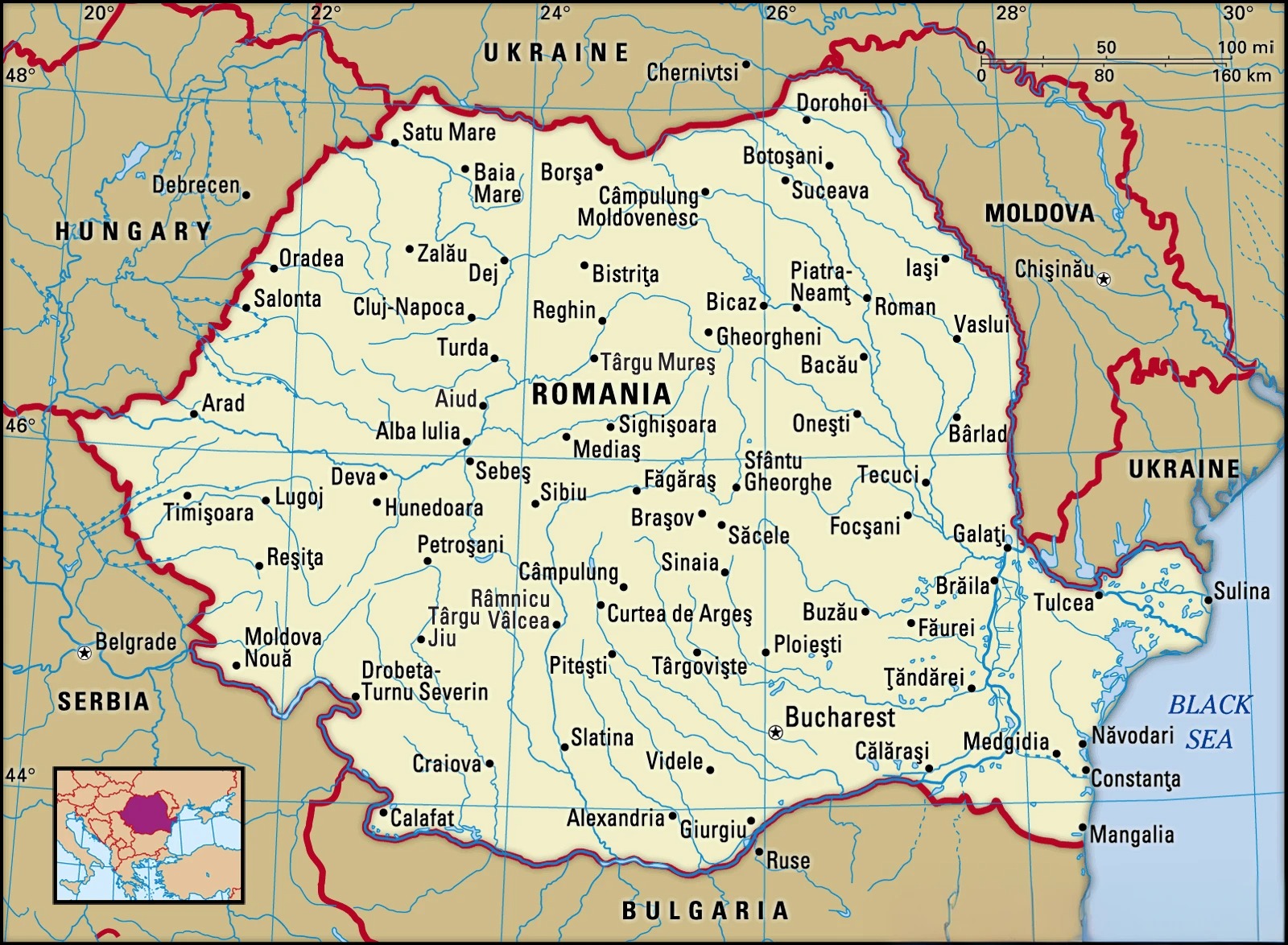 The physical map of Romania offers a detailed representation of the country’s diverse terrain. The country is divided into several distinct geographical regions, including the Carpathian Mountains, which run through the center of Romania, and the Danube River, which forms the southern border.