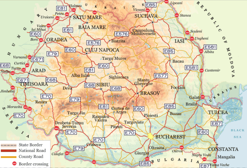 - National Roads and Highways: Major roads, such as the A1 (connecting Bucharest and Timișoara) and A2 (the highway to the Black Sea coast), are featured on this map. These highways are well-maintained, providing smooth access between cities and tourist destinations.