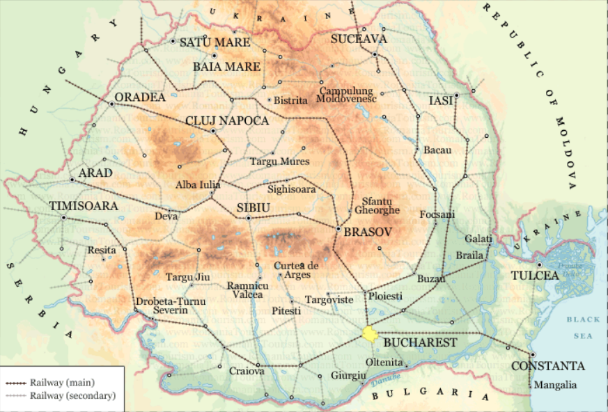 - Main Rail Routes: The map highlights important routes, such as the Bucharest-Constanța and Bucharest-Cluj-Napoca lines, providing easy access to major cities and attractions.