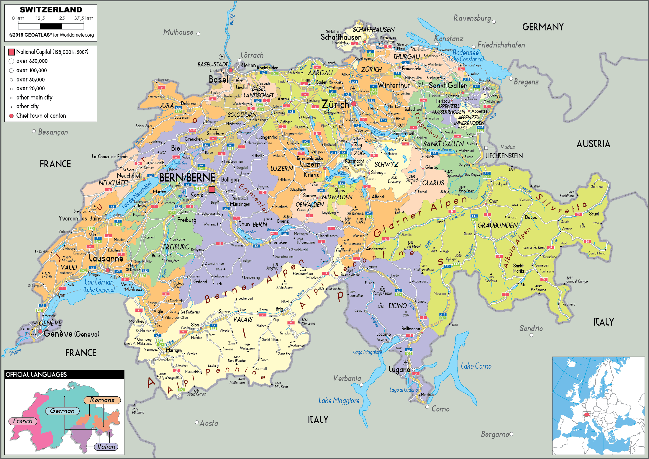 - Key Features: Major cities like Zurich, Geneva, and Bern, as well as the cantons, are displayed clearly.