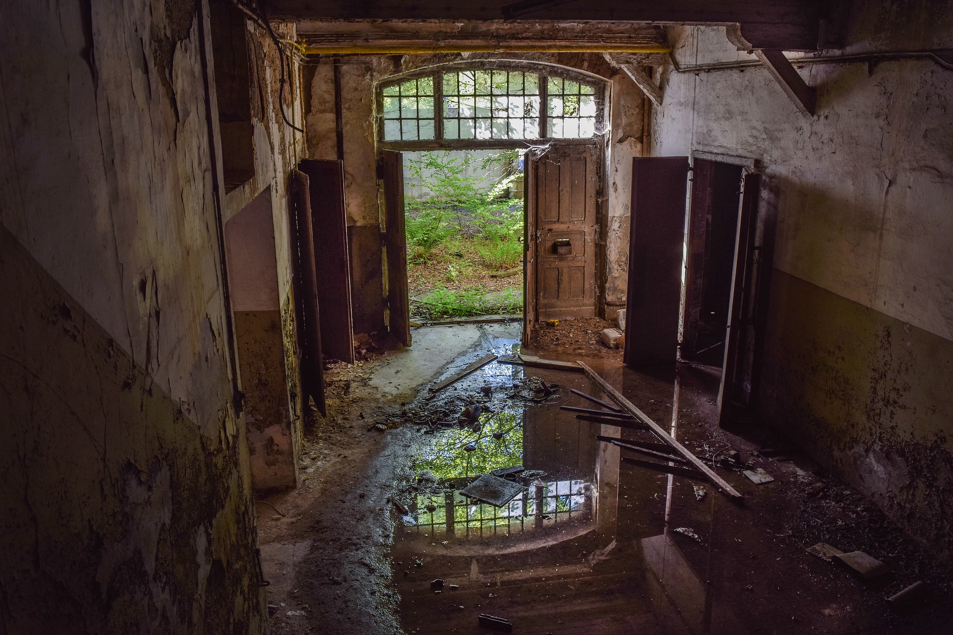Abandoned interior in Gdańsk with peeling walls, open door to overgrown yard, puddles reflecting window light and scattered debris Gdańsk is one of Europe's most unusual haunted cities because its ghosts are relatively recent. When the Soviet army took Gdańsk in March 1945, the city was almost destroyed. Approximately 90 percent of the historic centre was reduced to rubble, according to Polish historical records. The reconstruction that followed was extraordinary: the entire Old Town was rebuilt brick by brick from old photographs and drawings to look as it had before the war.
