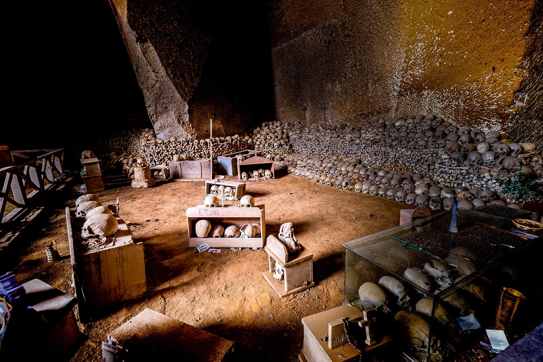 Underground ossuary filled with human skulls and bones, arranged in piles and displays, dimly lit with earthy tones throughout Naples saves the most extraordinary haunted tradition for last. No other city in Europe has a relationship with its dead quite like this. Naples sits atop ancient Greek and Roman ruins, and beneath them lies a network of volcanic tunnels, cisterns, and catacombs that extend for dozens of kilometres beneath the modern streets.