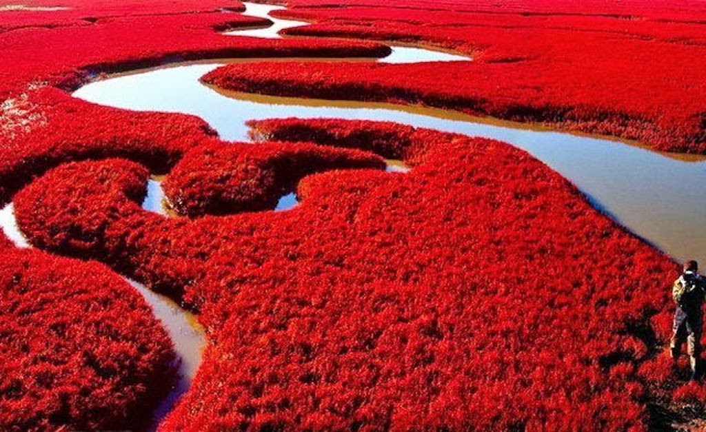 This stunning crimson scenery may be seen in China, near the city of Panjin. It's in the heart of a vast, sweeping wetland area in the Liaohe River Delta, but it's the only part of the marsh with this brilliant coloration.