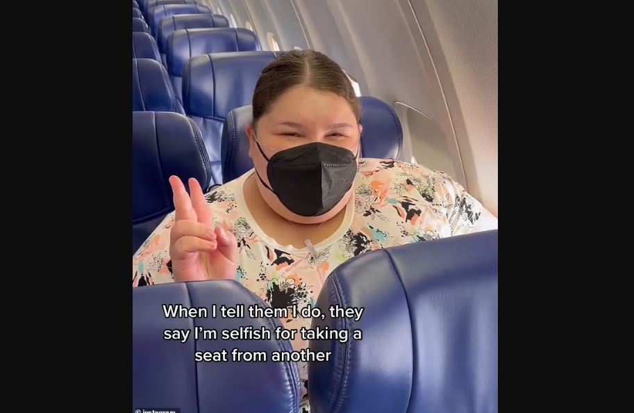 An Instagram post from Jaelynn Chaney of her in an airplane. In the video, text overlaid on the screen conveyed the conflicting perspectives she encounters: "They say it's not fair to the person who has to sit next me if I don't [buy an extra seat]. When I tell them I do, they say I'm selfish for taking a seat from another."