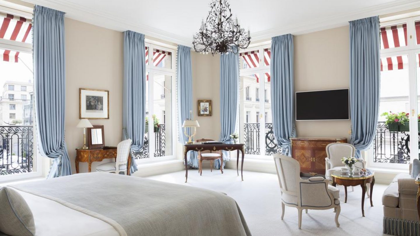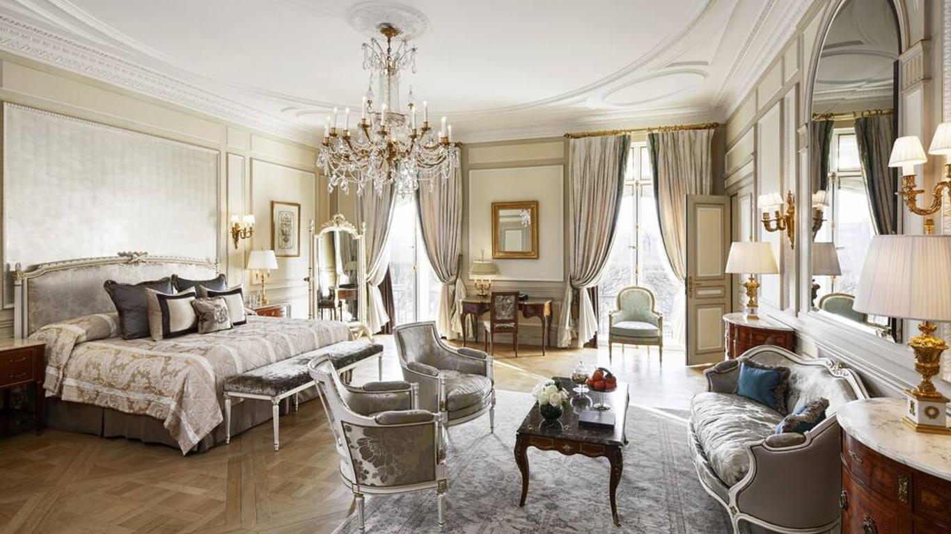This fancy hotel in Paris's 8th district has huge, beautiful rooms. A garden full of flowers makes it feel special. Its top restaurant, Le Cinq, has a Michelin star. The spa is pure pampering. It's a perfect spot for couples who love luxury.