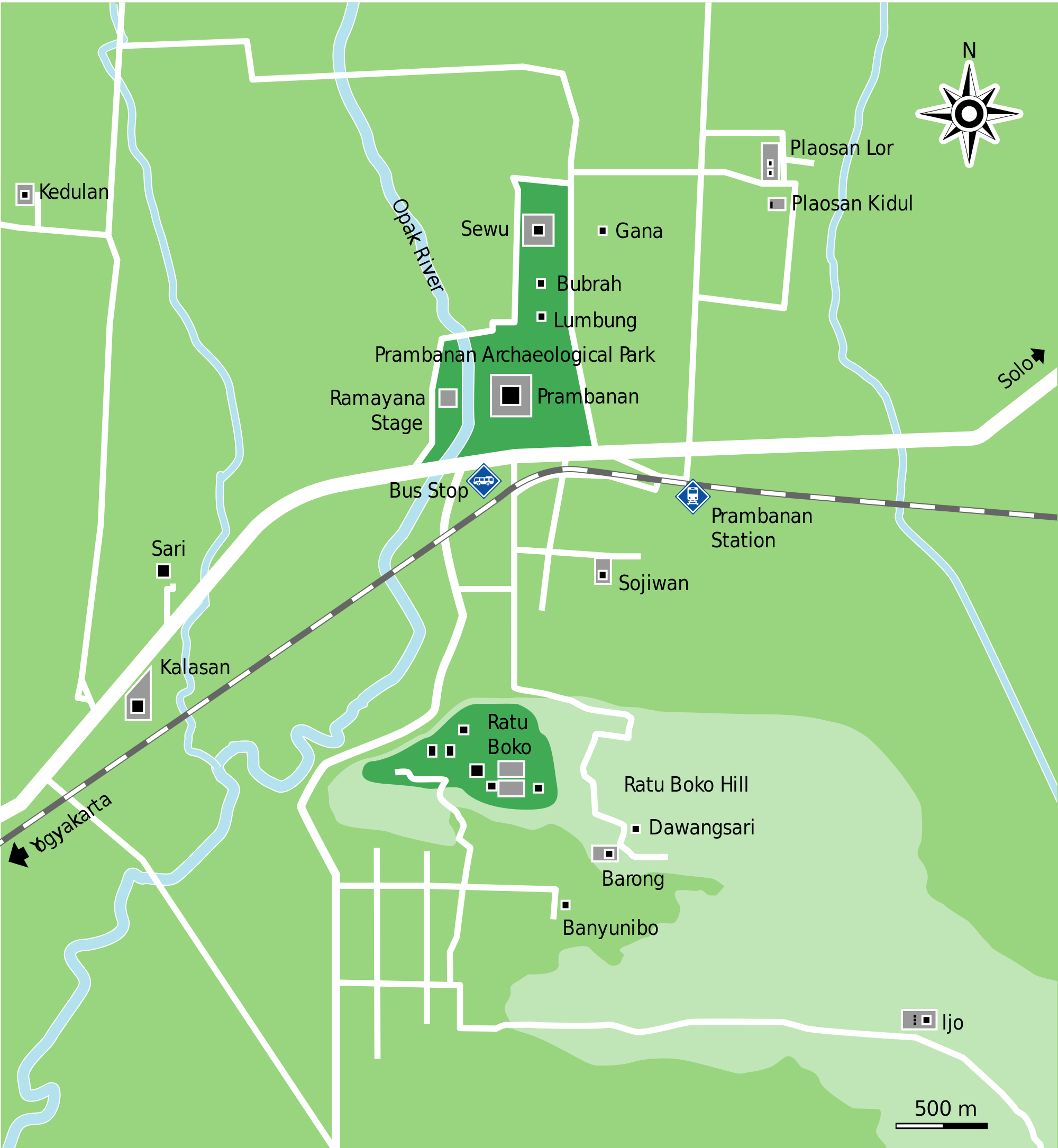 This is a general map of all the temples on the Prambanan plain, both tiny and huge. Prambanan is around 16 kilometers (10 miles) from Yogyakarta's city center, or a simple 30 minute journey.