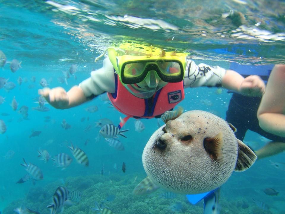 Blue Bay is one of the most famous tourist destinations in Mauritius. With its stunning beachesand crystal-clear waters, it is undoubtedly a spot where you will want to spend a significant amount of time. A young tourist scuba diving in Blue Bay Marine Park with a Puffer fish The Blue Bay Marine Park is located on the southeast coast of Mauritius, close to the airport and various hotels, all of which are within walking distance, making it extremely handy.