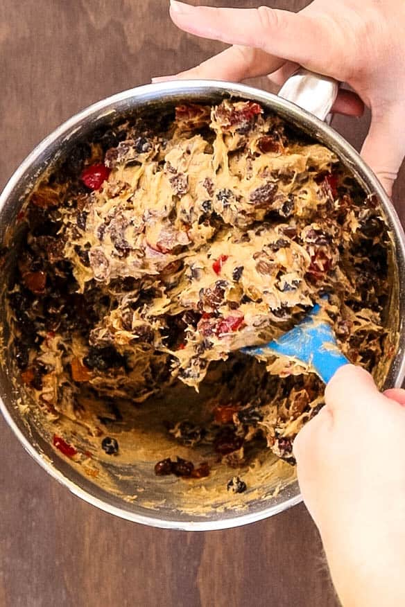 - Add the Soaked Fruit and Nuts: Stir in the soaked fruit mixture, including any leftover liquid from the soaking process, along with 100g of ground almonds (or chopped walnuts, if preferred). Also, add the zest of 1 lemon and 1 orange for a citrusy kick.