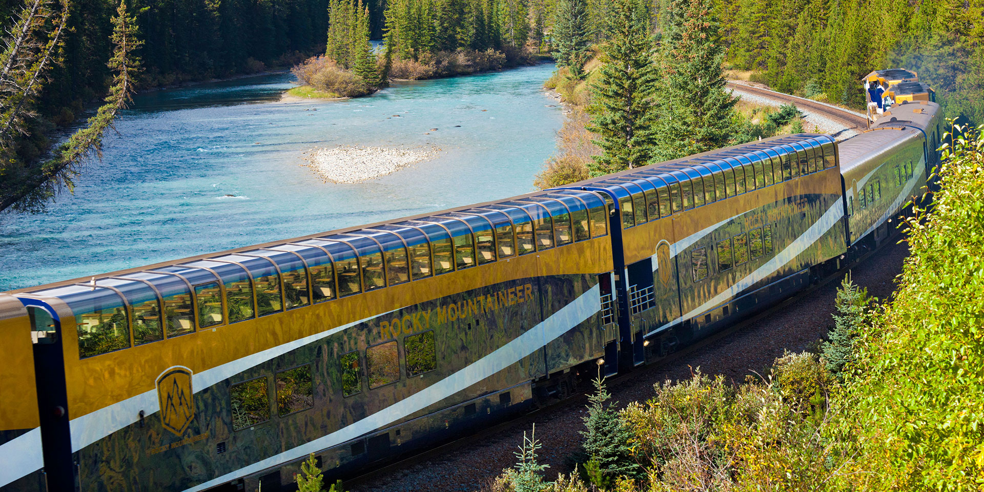 A Rocky Mountaineer Train Rocky Mountaineer is the most opulent way to experience a Canadian train vacation. Sit back in your comfortable seat and take in the breathtaking scenery as you travelthrough the Canadian Rockies. Rocky Mountaineer has two routes, each with its own distinct set of sights: Passengers on the First Passage to the West route travel from Vancouver to Banff/Lake Louise, with a shuttle transfer to Calgary. The beautiful Fraser Canyon and the Spiral Tunnels are among the highlights.