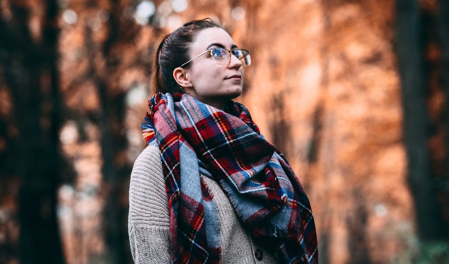 A woman with glasses and a scarf around ger neck It can be hard to keep privacy and personal space on a plane, especially in economy class. A scarf can help you feel more private without being rude. If you're trying to sleep, covering your face with a scarf can block out light from screens or overhead lights, making it easier to rest. It also shows others that you don’t want to talk right now.